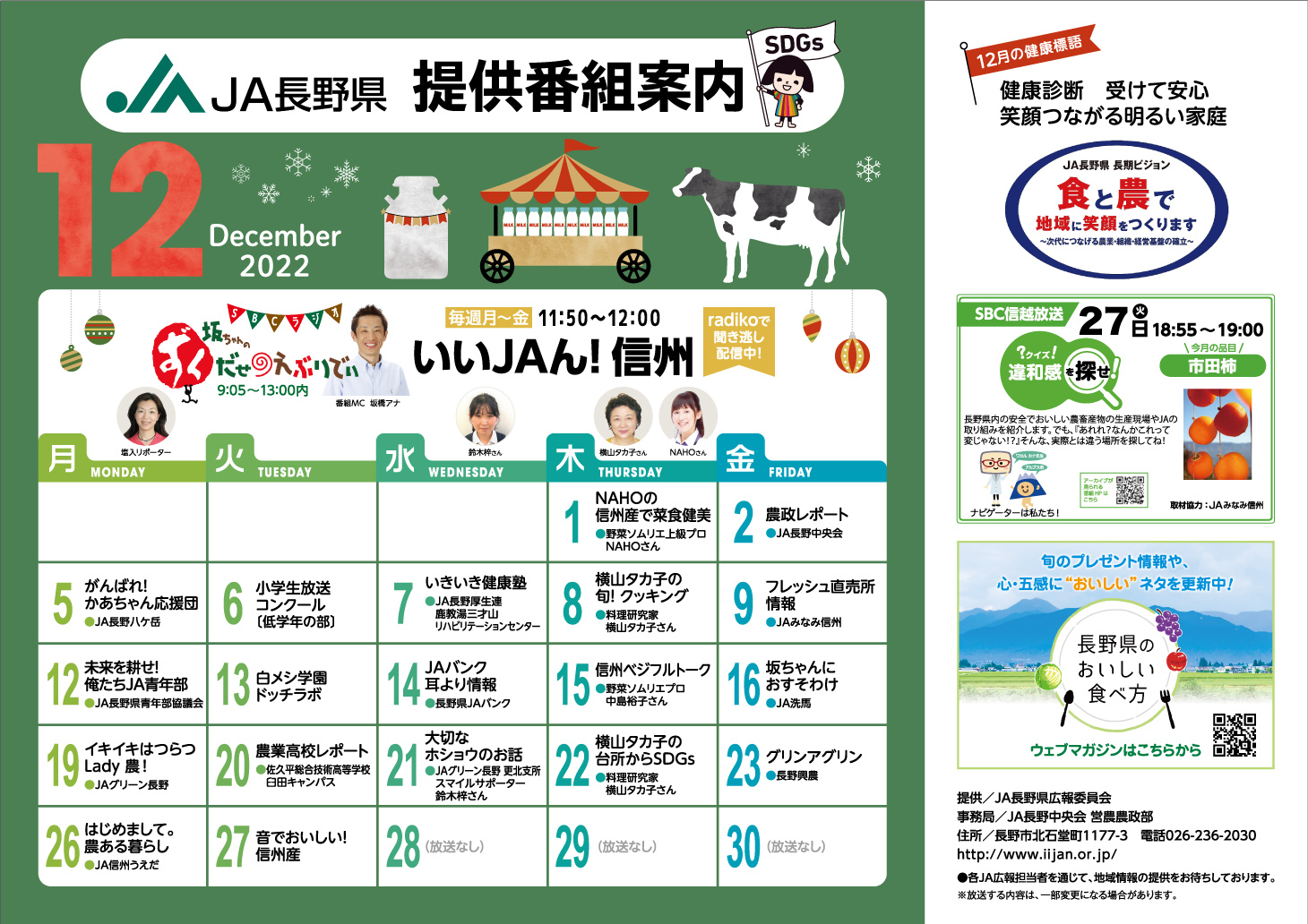 2022年12月のJA長野県提供番組案内案内を更新しました。