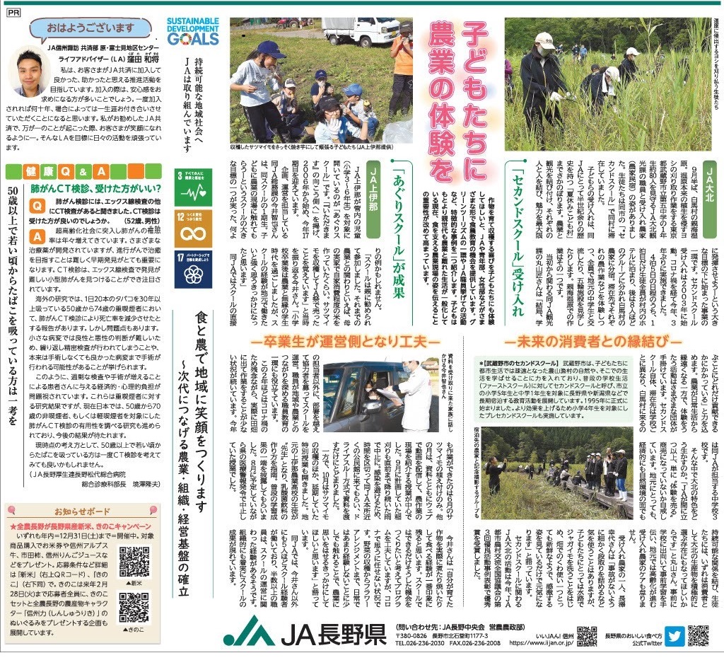 2022年11月04日 2022年11月1日付信濃毎日新聞掲載・食農教育の特集について ツイート 2022年11月1日付信濃毎日新聞にて、新規就農者の特集を掲載しました。 JAが作物を育て収穫することの喜びを伝えるため、子供たちの収穫体験の取り組みを紹介しています。特集はこちら↓2022年11月1日付信濃毎日新聞掲載特集
