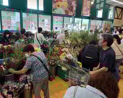 2023年08月17日 花市賑わう JA信州うえだ 農産物直売所ファーマーズうえだ店 JA信州うえだは8月10日~13日、農産物直売所などで恒例の花市を開いた。農畜産物直売所マルシェ国分(A・コープファーマーズうえだ店内)、では、開店と同時に盆用の切り花を求める多くの来場者で賑わった。直売所会員の生産者が栽培した小菊やトルコギキョウ・アスター等を、特設売り場に並べた。切り花は次々と売れ、売場のスタッフは花の補充に忙しく対応していた。来店客からは「人が多いのに驚いた。お値段以上の盆花が買えたので、仏壇や墓に飾りにぎやかにお盆を迎えたい」と話した。