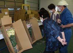 出荷本格化に合わせて9月25日には、ほ場巡回を27日には長野市篠ノ井の東部青果物流通センターで目揃い会を行い、生育状況や品質、出荷時期を確認。目揃会には部員8人と検品を担当する職員6人が出席し、出荷時の注意点を確認した。9月下旬以降、気温が下がるなか、開花も遅くなってきていることから、10月半ばまでは開花輪数を3輪に、以降は2輪半開花の状態で出荷するなど、気温に応じて収穫のタイミングを変えることを営農技術員が説明。また、気温の変化により花にシミが発生することもあるため、選別とハウス内の温度管理に注意するよう要請した。