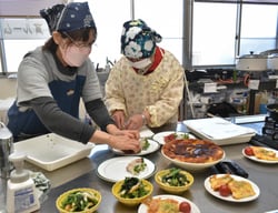 家庭や地域で実践できる知識・技能を身に付け、輝いて暮らすための生きがいづくりを目指すJAあづみ「第13期 生き活き塾」は9日、安曇野スイス村ハイジの里「食育ルーム」で第20回講座を開いた。この日は、塾生12人が参加。家の光に掲載されているレシピから厳選した、たんぱく質に着目した料理講習会を行った。たんぱく質が豊富な鶏肉や小松菜、玉ねぎを使った「カレースープ煮」やたんぱく質を多く含むすりゴマを使用した「ほうれん草とちくわのゴマ和え」、「鶏ささ身のチーズピカタ」、鮪や鯛を使った「カイワレ紅白巻き」の計4品を調理実習した。またデザートでは、JA職員が考案した旬の「サンふじ」を使ったフライパン1枚で作る「焼きリンゴケーキ」も作った。